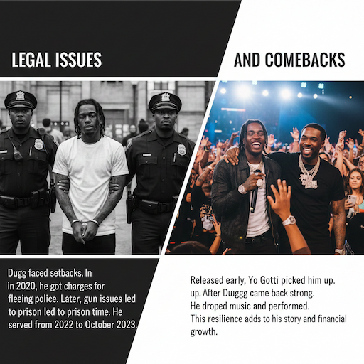 Dugg faced setbacks. In 2020, he got charges for fleeing police. Later, gun issues led to prison time.