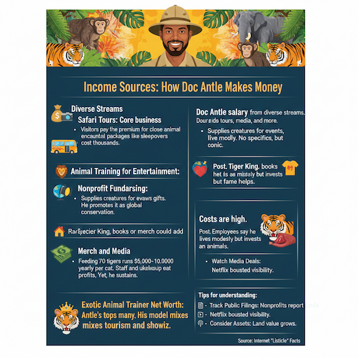 Doc antle net worth reaches about $10 million in 2026, built from Myrtle Beach Safari tours, Hollywood animal training, and conservation efforts. His journey from California farm kid to Tiger King star mixes success with scandals. Legal issues, including a 2025 prison sentence for trafficking, tested his finances, but his business endures. He remains a figure of intrigue for animal lovers and controversy trackers alike.
